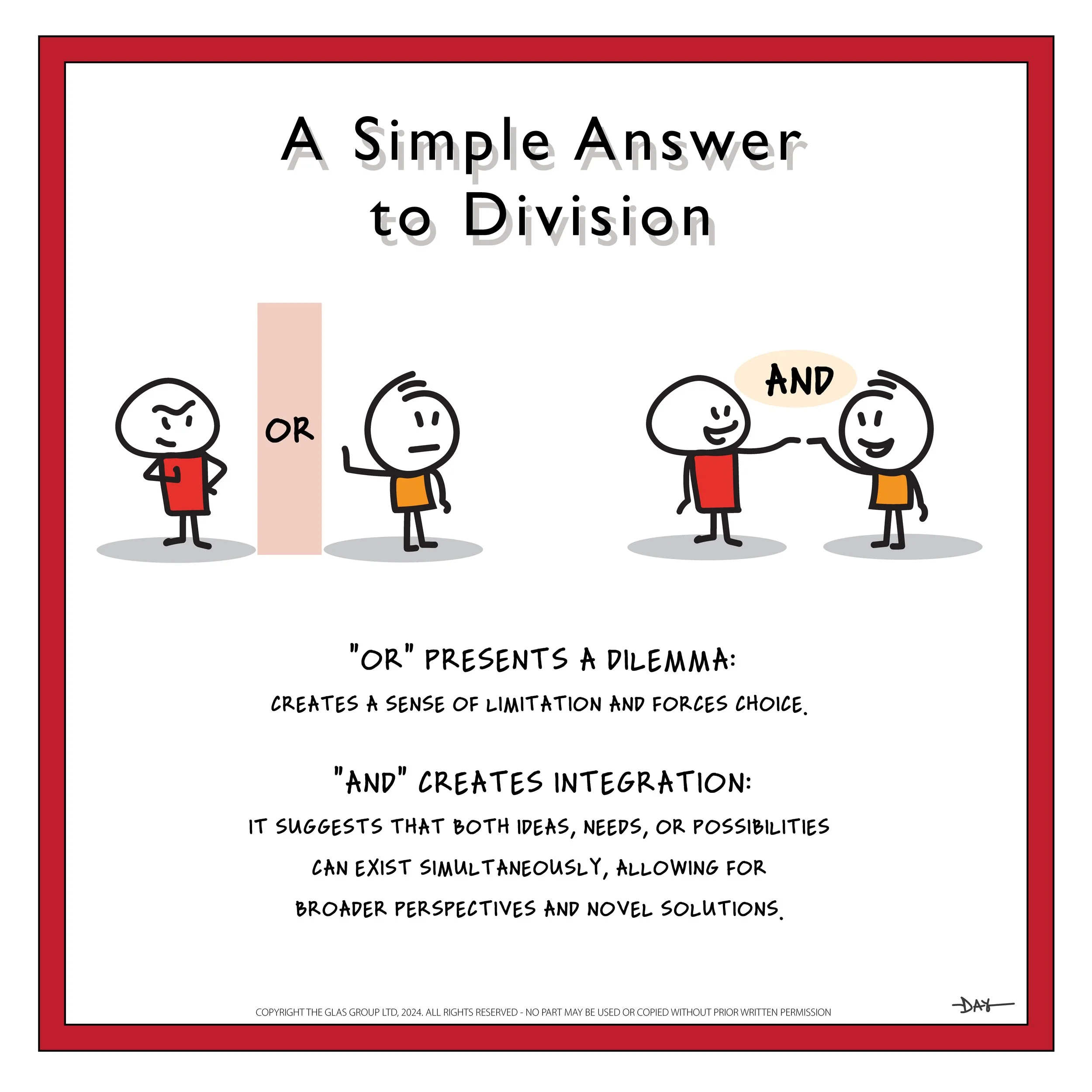 The linking approach of ‘and’ shifts a mindset from limited choices to recognising possibilities, fostering collaboration, and embracing complexity. Instead of viewing situations as a trade-off or a contradiction, using "and" acknowledges that multiple, even opposing, realities can coexist and be integrated, leading to more creative solutions and positive communication.