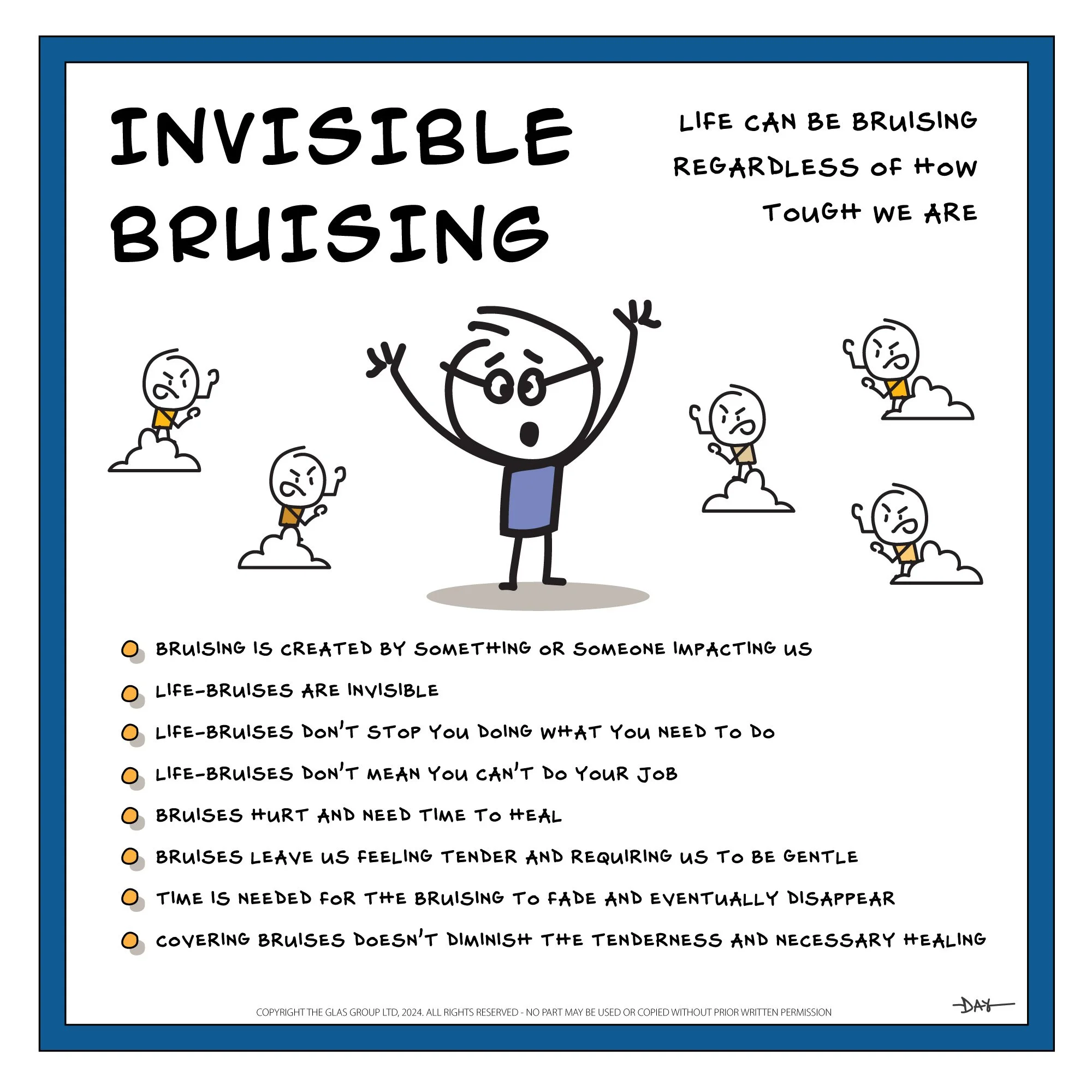 Now, bruises don’t stop you doing what you need to do, they don’t prevent you functioning as a parent or friend, they don’t mean you can’t do your job…but, bruises hurt - some more than others. Whilst we have a bruise, we are healing. If we get knocked in the same spot it’s even more painful given it’s pain + pain.