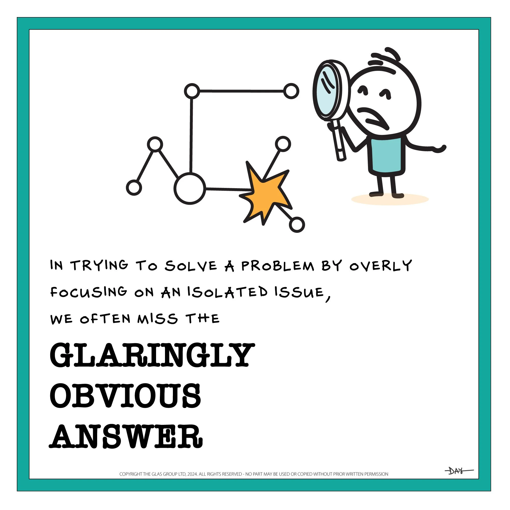The ability to step back and see all possibilities, all pieces and how everything needs to work together is a skill we can all too easily neglect. When we take the ‘quick fix’ option and try and solve a problem by overly focusing on an isolated issue, we miss the ‘often glaringly’ obvious answer. If you want to resolve something in a meaningful and sustainable way, pause and consider the whole system before jumping to a short-term solution.